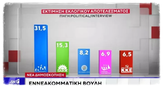 Συγκεκριμένα στην εκτίμηση ψήφου η Νέα Δημοκρατία προηγείται με ποσοστό 31,5%. Ακολουθεί το ΠΑΣΟΚ με 15,3%.