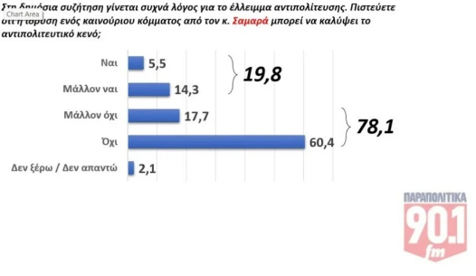 Στο αντίστοιχο ερώτημα για την περίπτωση ίδρυσης κόμματος από τον κο Σαμαρά, το 19,8% θεωρεί αν ιδρύσει τελικά κόμμα θα καλύψει το αντιπολιτευτικό κενό, ενώ το επίσης συντριπτικό 78,1% θεωρεί πως δεν θα το καταφέρει, ενώ σύμφωνα με την ίδια δημοσκόπηση, το εκλογικό κοινό που απεθύνεται αθροίζει ένα περίπου 8,6%.