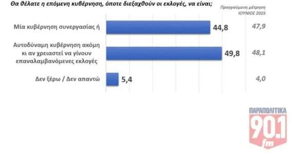 Ένας στους δό ερωτώμενους (ποσοστό 49,8% αυξημένο σε σχέση με την προηγούμενη μέτρηση) θέλει να προκύψει αυτοδύναμη κυβέρνηση ακόμη και αν απαιτηθούν επαναλαμβανόμενες εκλογές. Αντίθετα, υποχωρεί το ποσοστό όσων θέλουν κυβέρνηση συνεργασίας (από 47,9% στο 44,8%).
