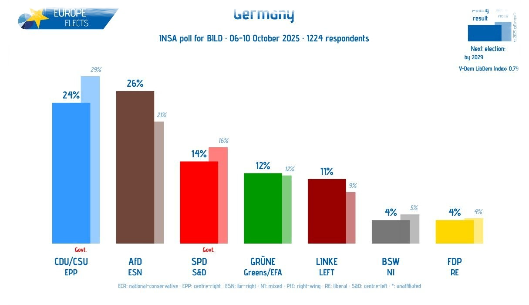 Σε δημοσκόπηση του Ινστιτούτου Insa για την εφημερίδα Bild, που έλαβε χώρα μεταξύ 6 και 10 Οκτωβρίου, το AfD εμφανίζει σημαντική αύξηση 5 μονάδων, με αποτέλεσμα να καταλαμβάνιε την πρώτη θέση μεταξύ των ερωτηθέντων.
