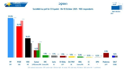 Σε πρόσφατη δημοσκόπηση στην Ισπανία, το κεντροδεξιό Λαϊκό κόμμα, είδε το ποσοστό του να αυξάνεται κατά σχεδόν 3 μονάδες, σε σύγκριση με τις τελευταίες βουλευτικές εκλογές και να σκαρφαλώνει στο 34%.