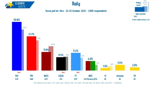 Σύμφωνα με τη δημοσκόπηση, ο κυβερνητικός συνασπισμός που περιλαμβάνει το κόμμα της κας Μελόνι FdI (Αδέλφια της Ιταλίας), τη Lega του Ματέο Σαλβίνι και το Forza Italia του Αντόνιο Ταγιάνι, αθροίζει ποσοστό που υπερβαίνει το 50%.