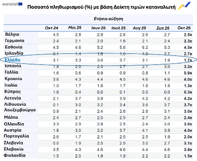 Σημειώνεται ότι, ο μήνας Οκτώβριος ήταν ιδιαίτερα θετικός για τον Ελληνικό πληθωρισμό, μιας και η Ελλάδα παρουσίασε ετήσια αύξηση μικρότερη κατά 0,4 μονάδες από τον Ευρωπαϊκό μέσο όρο, με ποσοστό που είναι το 5ο μικρότερο σε επίπεδο Ευρωζώνης.