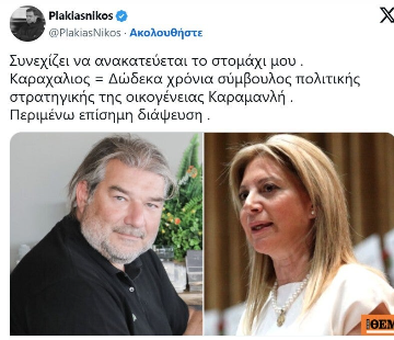 Εξηγώντας, μάλιστα, την αντίδρασή του, ο κ. Πλακιάς συνεχίζει στη σημερινή ανάρτησή του γράφοντας "Καραχάλιος=Δώδεκα χρόνια σύμβουλος πολιτικής στρατηγικής της οικογένειας Καραμανλή."
