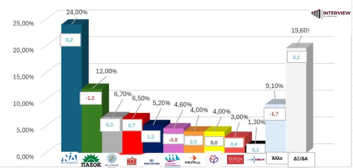 Νέα δημοσκόπηση της εταιρεία Interview για το Political,gr εμφανίζει τη ΝΔ να διευρύνει το προβάδισμά της στην πρόθεση ψήφου, παρά τις οριακές της απώλειες.