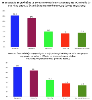 Οι πρόσφατες συμφωνίες που ανακοινώθηκαν πανηγυρικά κατά τη Σύνοδο για τη Διατλαντική Ενεργειακή Συνεργασία (6-7 Νοεμβρίου) έχουν ευρεία στήριξη. Ως προς την ανακοίνωση για τις γεωτρήσεις της αμερικανικής ExxonMobil στο Ιόνιο, το 58,3% (30,5% «σίγουρα ναι» και 27,8% «μάλλον ναι») κρίνει ότι αποτελεί θετικό βήμα για τα εθνικά συμφέροντα.