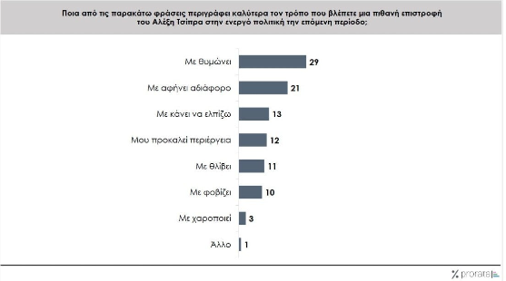 Το 71% αντιδρά αντελώς αρνητικά στο ενδεχόμενο επιστροφής του στην πολιτική σκηνή, με το 29% να δηλώνει πως "θυμώνει" με το ενδεχόμενο, το 21% πως "το αφήνει αδιάφορο" και το 21% πως "το θλίβει" ή και "το φοβίζει".