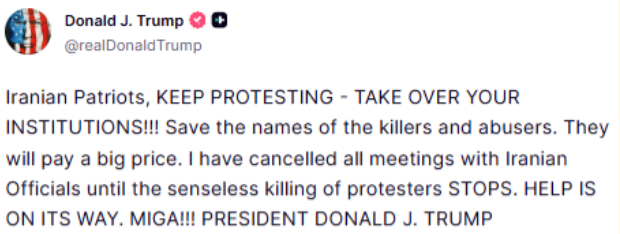 Ο πρόεδρος των ΗΠΑ κάλεσε τους διαδηλωτές στο Ιράν να "ΣΥΝΕΧΙΣΟΥΝ ΝΑ ΔΙΑΜΑΡΤΥΡΟΝΤΑΙ". Ως αποτέλεσμα της βίας κατά των διαδηλωτών, ο Τραμπ λέει ότι "ακύρωσε όλες τις συναντήσεις με Ιρανούς αξιωματούχους" μέχρι να σταματήσει η καταστολή. Ο πρόεδρος των ΗΠΑ προσθέτει: "Η ΒΟΗΘΕΙΑ ΕΙΝΑΙ ΕΙΝΑΙ ΚΑΘ ΟΔΟΝ!".