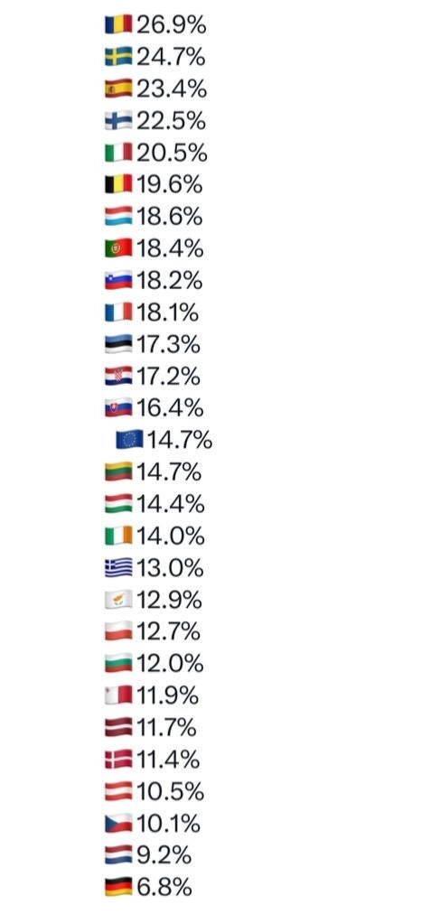 Το χαμηλότερο ποσοστό κατέγραψε η Γερμανία με 6,8%.