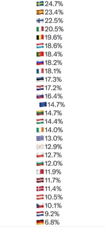 Το χαμηλότερο ποσοστό κατέγραψε η Γερμανία με 6,8%.