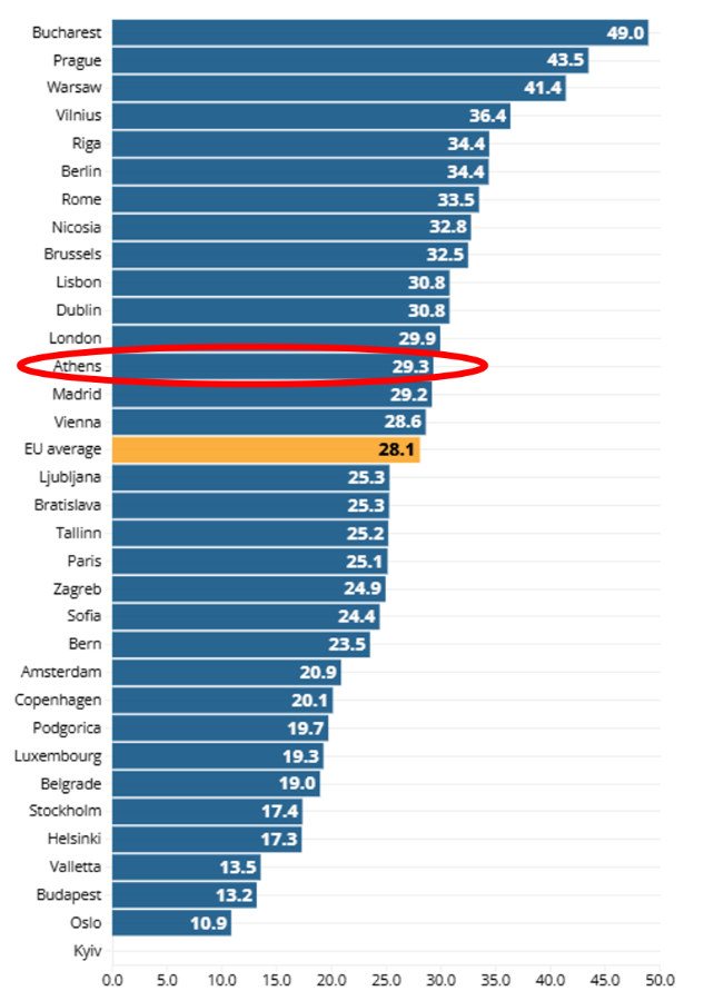 Η Αθήνα με €29,3, βρίσκεται λίγο πάνω από τον Ευρωπαϊκό μέσο όρο.
