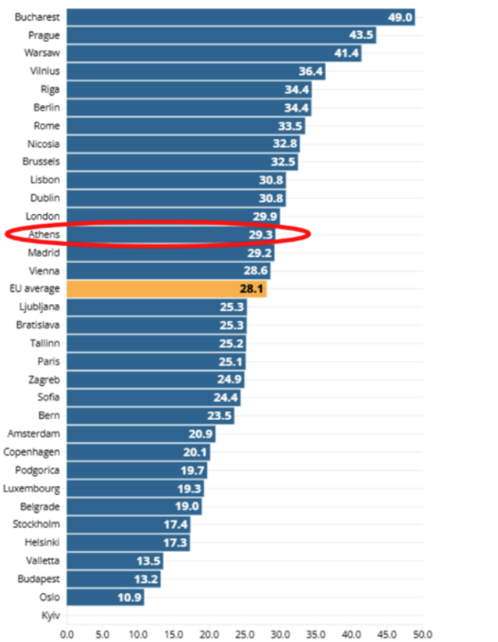 Η Αθήνα με €29,3, βρίσκεται λίγο πάνω από τον Ευρωπαϊκό μέσο όρο.