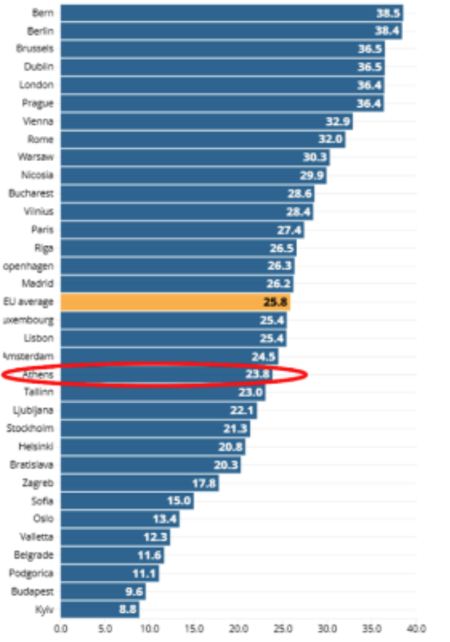 Η Αθήνα με €23,8 βρίσκεται κάτω από τον Ευρωπαϊκό μέσο όρο.