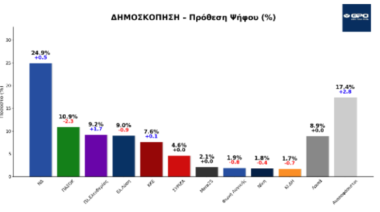 Σε σύγκριση με δημοσκόπηση της ίδιας εταιρείας του Οκτωβρίου 2025, η ΝΔ ανεβαίνει κατά 0,5, το ΠΑΣΟΚ υποχωρεί κατά 2,3, ανεβασμένη η Πλεύση κατά 1,7 και 0,9 πτώση για το κόμμα του κου Βελόπουλου.