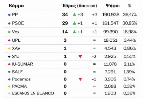 Το κυβερνών σοσιαλιστικό κόμμα, διατηρεί τα ποσοστά του κερδίζοντας μία παραπάνω έδρα. Μια επιπλέον έδρα κερδίζει και το ακροδεξιό Vox, ανεβάζοντας κατά 2 μονάδες τα ποσοστά του.