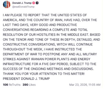 Ο Ντόναλντ Τραμπ ανήρτησε ότι έδωσε εντολή στον αμερικανικό στρατό να αναβάλει "όλες τις στρατιωτικές επιθέσεις εναντίον ιρανικών σταθμών παραγωγής ενέργειας και ενεργειακών υποδομών" μετά από δύο ημέρες "πολύ καλών και παραγωγικών συνομιλιών" με το Ιράν.
