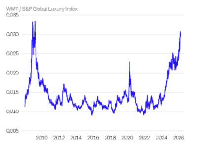 Ο λεγόμενος "Δείκτης Ύφεσης Walmart" (WRS) συγκρίνει την πορεία της μετοχής της εταιρείας (+10,9% από την αρχή του έτους) με τον δείκτη πολυτελών αγαθών S&P Global Luxury Index (-14,8% από την αρχή του έτους).