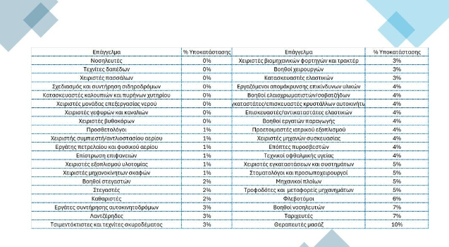 Επίσης, στις 40 πιο εκτεθειμένες θέσεις εργασίας ήταν οι βοηθοί εξυπηρέτησης πελατών (72%), οι οικονομικοί σύμβουλοι (69%) και οι προωθητές προϊόντων (62%). Αναζητήστε τον παρακάτω πίνακα για να δείτε το δυνητικό μέλλον του επαγγέλματός σας...