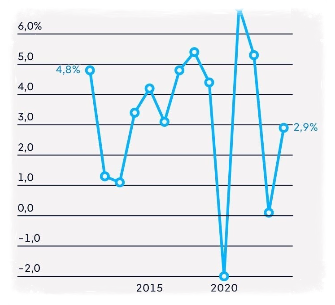 Με αύξηση του ΑΕΠ σχεδόν 3% το 2024, η χώρα βρίσκεται μπροστά από τον ρυθμό ανάπτυξης της τάξεως του 1% σε ολόκληρη την ΕΕ και μπροστά από τις δύο μεγαλύτερες οικονομίες της Ένωσης, τη Γαλλία και τη Γερμανία.