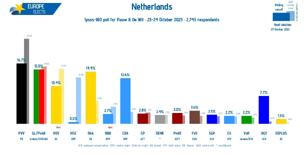 Το συντηρητικό VVD, το πρώην κόμμα του πρώην πρωθυπουργού Mark Rutte, το οποίο κυριάρχησε στην ολλανδική πολιτική σκηνή αυτόν τον αιώνα, αναμένεται να χάσει περίπου το ένα τρίτο του ήδη μειωμένου εκλογικού σώματος του 2023, κυρίως από το ριζοσπαστικό δεξιό JA21. Η αριστερά παραμένει μάλλον περιθωριακή και στάσιμη - παρά την πρόσφατη συγχώνευση των Πρασίνων και των Εργατικών στο GL/PvdA. Είναι ενδιαφέρον ότι οι δημοσκοπήσεις δείχνουν ότι η κύρια μάζα των ψηφοφόρων κατευθύνεται εντός των τριών εκλογικών συνασπισμών, δηλαδή της ακροδεξιάς, της κεντροδεξιάς και της αριστεράς. Κάθε μπλοκ διατηρεί σε μεγάλο βαθμό την ίδια υποστήριξη - 35%, 40% και 25% αντίστοιχα - αλλά εντός του ακροδεξιού μπλοκ, το JA21 γίνεται το δεύτερο μεγαλύτερο (μετά το PVV), ενώ στο κεντροδεξιό μπλοκ το CDA, και πιθανώς το D66, ξεπερνούν το VVD.