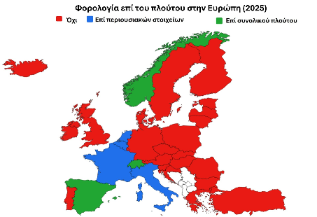 Γαλλία: Οι φορολογούμενοι κάτοικοι Γαλλίας υπόκεινται σε φόρο ακίνητης περιουσίας εάν τα καθαρά παγκόσμια ακίνητα περιουσιακά τους στοιχεία αποτιμώνται σε €1,3 εκ. ή περισσότερο. Οι μη κάτοικοι υπόκεινται επίσης εάν η αξία των γαλλικών ακίνητων περιουσιακών τους στοιχείων πληροί ή υπερβαίνει το ίδιο όριο. Ανάλογα με την καθαρή αξία των περιουσιακών στοιχείων, ο φορολογικός συντελεστής μπορεί να φτάσει έως και το 1,5%. Η Ιταλία, το Βέλγιο και η Ολλανδία επιβάλλουν επίσης ορισμένους φόρους επί του πλούτου, όπως τα χρηματοοικονομικά περιουσιακά στοιχεία. (Η Ελλάδα δεν περιλαμβάνεται στη λίστα αν και εισπτράττει ΕΝΦΙΑ.)