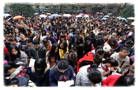 Παρόλο που οι θέσεις εργασίας στον δημόσιο τομέα έχουν γενικά χαμηλότερους μισθούς - και τα τελευταία χρόνια ορισμένες χρεωμένες τοπικές αρχές δυσκολεύονται γενικά να πληρώσουν μισθούς - οι θέσεις εργασίας είναι ολοένα και πιο περιζήτητες για την ασφάλειά που παρέχουν σε μια ολοένα και πιο απαιτητική οικονομία. Ανατρέχοντας στην εποχή του Μαοϊσμού, οι θέσεις εργασίας στις δημόσιες υπηρεσίες είναι γνωστές ως "σιδερένιο μπολ με ρύζι" - ένα ιδίωμα που αναφέρεται στο να έχεις μια δουλειά εφ' όρου ζωής. Στα χρόνια των μεταρρυθμίσεων και του ανοίγματος της Κίνας, η βύθιση στους κινδύνους και τα οφέλη των εμπορικών επιχειρήσεων ήταν γνωστή ως xiahai, ή "άλμα στη θάλασσα". Τώρα οι άνθρωποι μιλάνε για shangan, ή "προσγείωση στην ξηρά," για να περιγράψουν την επιτυχή ολοκλήρωση των εξετάσεων στον σταθερό δημόσιο τομέα.