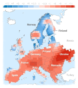 Επειδή το νερό είναι βαρύ, οι μεταβολές στα υπόγεια ύδατα, τα ποτάμια, τις λίμνες, την υγρασία του εδάφους και τους παγετώνες εμφανίζονται στο δορυφορικό σήμα, επιτρέποντας στους δορυφόρους να "ζυγίσουν" αποτελεσματικά πόσο νερό είναι αποθηκευμένο. Τα ευρήματα αποκαλύπτουν μια έντονη ανισορροπία: η βόρεια και βορειοδυτική Ευρώπη - ιδιαίτερα η Σκανδιναβία, τμήματα του Ηνωμένου Βασιλείου και της Πορτογαλίας - έχουν γίνει πιο υγρές, ενώ μεγάλες εκτάσεις του νότου και της νοτιοανατολικής περιοχής, συμπεριλαμβανομένων τμημάτων του Ηνωμένου Βασιλείου, της Ισπανίας, της Ιταλίας, της Γαλλίας, της Ελβετίας, της Γερμανίας, της Ρουμανίας και της Ουκρανίας, έχουν στεγνώσει.