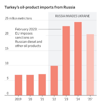 Η Τουρκία είναι ο μεγαλύτερος αγοραστής ρωσικών πετρελαϊκών προϊόντων, όπως το ντίζελ και το μαζούτ, και ένας από τους μεγαλύτερους αγοραστές ρωσικού αργού μετά την Κίνα και την Ινδία. Ο Πρόεδρος Τραμπ ζήτησε από την Τουρκία και την Κίνα να σταματήσουν το εμπόριο και επέβαλε δασμούς στην Ινδία για τις αγορές της.