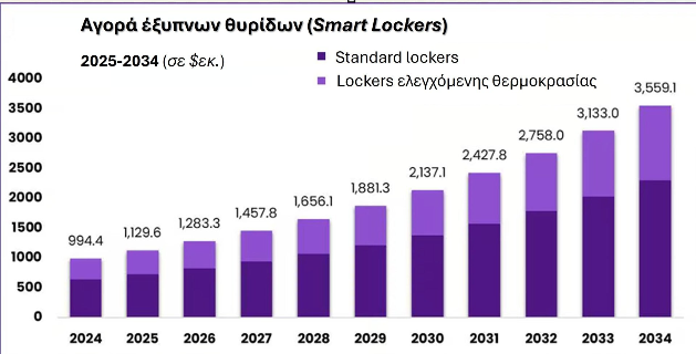 Το μέγεθος της αγοράς των Έξυπνων θυρίδων (smart lockers) αναμένεται να φτάσει στο επίεπδο των περίπου $3,559.1 εκ. μέχρι το 2034, από $994.4 εκ. ΗΠΑ το 2024, αυξανόμενη με ετήσιο ρυθμό ανάπτυξης (CAGR) 13.60% την περίοδο από το 2025 έως το 2034. Το 2024 το μεγαλύτερο μερίδιο είναι συγκεντρωμένο στη Βόρεια Αμερική, περιοχή που εμφανίζει συνολικό μερίδιο άνω του 37.4% της συολικής αγοράς Smart Lockers, με έσοδα που φτάνουν τα $369.3 εκ. ΗΠΑ.