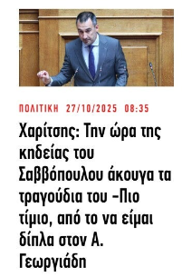 Ο "κύριος" λοιπόν Χαρίτσης, δεν πήγε στην κηδεία του Νιόνιου, γιατί θα ήταν εκεί και ο Γεωργιάδης. Σαν την κυρά Κούλα από τη Νεστάνη που δεν πήγε στην κηδεία της συμπεθέρας, γιατί θα ήταν και η Παναγιώταινα που της κλέβει τα σύκα απ' τη συκιά της. Προτίμησε να κάτσει σπίτι και να "ακούει λέει" τραγούδια του. Αν άκουγε Back to Back το "Κωλοέλληνες," το λες και αυτοκριτική.