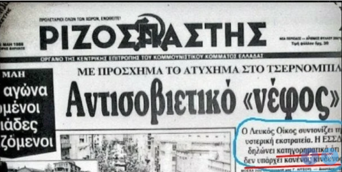 Ναι, είναι οι ίδιοι, που όταν έσκασε το Τσέρνπμπιλ και ούτε καν γνωρίζουμε πόσοι άνθρωποι σε όλη την Ευρώπη πέθαναν από καρκίνο, έγραφαν στις κομματικές φυλλάδες τους ότι, το Τσέρνμπιλ ήταν εφεύρεση της CIA για να δημουργήσει ένα "αντισοβιετικό νέφος"