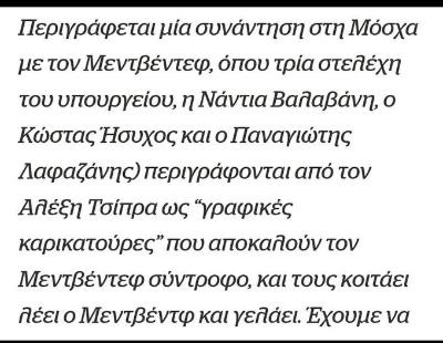 Ο Τσίπρας είπε ότι κάτι ξέχασε, έτρεξε πίσω στην αίθουσα, βρήκε τον Μεντβέντεφ και με αγωνία του είπε "Μην μεταφέρεις στον Βλαδίμηρο όσα σου είπαν, οι άνθρωποι είναι γραφικές καρικατούρες."