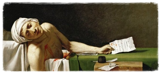 Η σπουδαία τέχνη μας υποχρεώνει σε δεύτερες και τρίτε αναγνώσεις. Μας κάνει να κοιτάμε έαν έργο τέχνης και μετά να το δούμε ξανά με άλλη οπτική. Πάρτε για παράδειγμα τον "Θάνατο του Μαρά," εργο του 1793, ίσως την πιο διάσημη απεικόνιση τόπου εγκλήματος των τελευταίων 250 ετών. Με την πρώτη ματιά, η απεικόνιση του δολοφονημένου σώματος του Γάλλου επαναστάτη Ζαν-Πολ Μαρά, ο οποίος μαχαιρώθηκε θανάσιμα στο μπάνιο του στις 13 Ιουλίου 1793, δύσκολα θα μπορούσε να είναι απλούστερη. Ο δολοφονημένος δημοσιογράφος, ο οποίος είχε αγωνιστεί για την εκτέλεση του βασιλιά Λουδοβίκου ΙΣΤ΄, σωριάζεται προς το μέρος μας - το σώμα του πλαισιωμένο από το απέραντο τρεμάμενο κενό που απλώνεται από πάνω του.