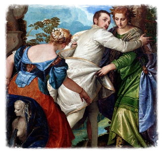 Η αντιπαράθεση μεταξύ των γυναικείων δυνάμεων απηχεί την Αλληγορία της Αρετής και της Κακίας του Βερονέζε, περίπου το 1565